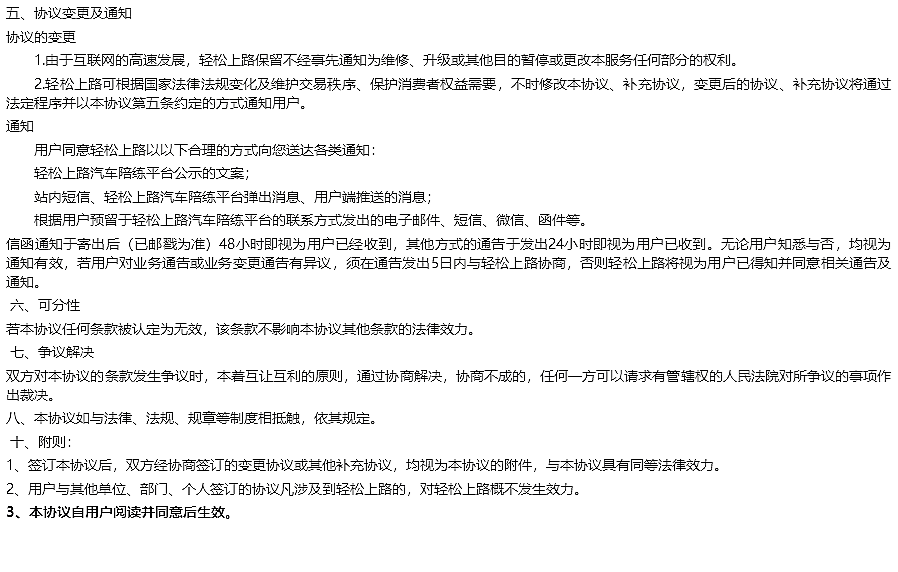 2.轻松上路可根据国家法律法规变化及维护交易秩序、保护消费者权益需要,不时修改本协议、补充协议,变更后的协议、补充协议将通过法定程序并以本协议第五条约定的方式通知用户。
